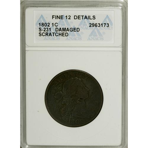 <B>1802 1C --Damaged, Scratched--ANACS. Fine 12 Details.</B></I> S-231. NGC Census: (25/335). PCGS Population (18/246). Mintage: 3,435,100. Numismedia Wsl. Price for NGC/PCGS coin in F12: $160. (#1470)<BR><BR><b>Shipping:</b> Coins & Currency (<a target="_blank" href="http://www.heritageauctions.com/common/shipping.php">view shipping information</a>)