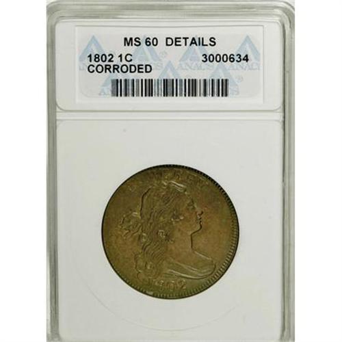 <B>1802 1C --Corroded--ANACS. MS60 Details.</B></I> S-232, B-12, R.1. An interesting variety that has a T in LIBERTY cut over a Y, and a set of denticles clashed onto the reverse between the wreath and a recut R in AMERICA. Although designated as "Corroded" by ANACS, this attractive deep golden-brown cent in fact shows little granularity, and is a find for the dedicated specialist. Liberty's curls are well struck. EAC 50.<BR><I>From The Laguna Niguel Collection, Part Two.</B></I><BR><BR><B>Coin Engraver:</B> Robert Scot<BR><BR><b>Shipping:</b> Coins & Currency (<a target="_blank" href="http://www.heritageauctions.com/common/shipping.php">view shipping information</a>)