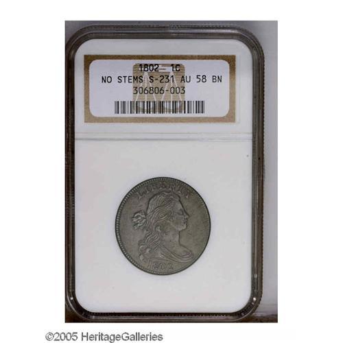 <B>1802<1C> No Stems AU58 NGC.</B></I> S-231, R.1. Die State II. One of two No Stems die pairings for 1802, but the single fraction bar uniquely identifies Sheldon-231. A sharp olive-brown Draped Bust Cent with a generous quotient of shimmering mint luster and only slight friction on the leaves, forehead, and other highpoints. Tiny obverse marks are distributed but do not distract.