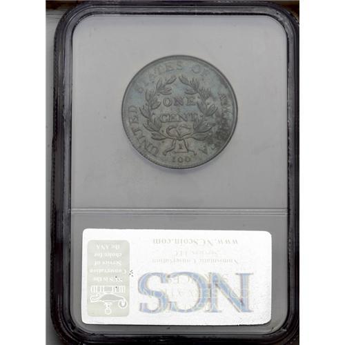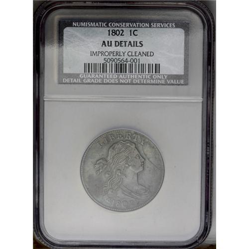 <B>1802<1C> No Stems--Improperly Cleaned--NCS. AU Details.</B></I> S-231, B-9, R.1. This hairlined cent has unnaturally light aqua-blue fields. Slightly granular medium mauve patina is noted at 7:30 on the obverse, and 4:30 on the reverse. Both sides display several distinctive die cracks. EAC 25.