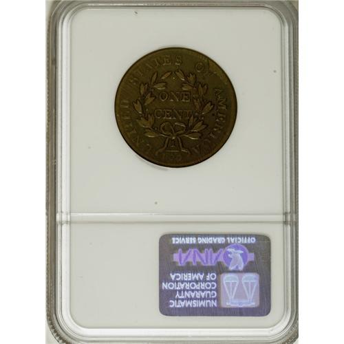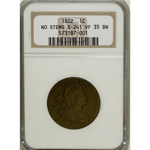 <B>1802 1C No Stems VF35 NGC.</B></I> S-241, B-20, R.1. Breen Die State IV with a reverse cud at 2 o'clock. A blundered die with a widely repunched second S in STATES and a double fraction bar, in addition to the absent stems. This richly detailed large cent has consistent and finely granular ebony-brown surfaces. EAC 20.<BR><BR><b>Shipping:</b> Coins & Currency (<a target="_blank" href="http://www.heritageauctions.com/common/shipping.php">view shipping information</a>)