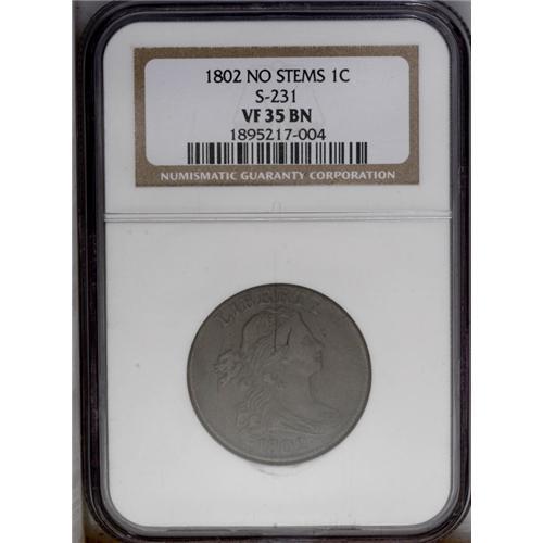 <B>1802 1C No Stems VF35 NGC.</B></I> S-231, R.1. Smooth olive and tan surfaces with splashes of darker steel color. Both sides of this cent are lightly abraded, pretty much consistent with the grade. EAC 20.