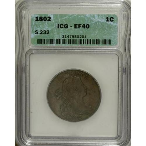 <B>1802 1C XF40 ICG.</B></I> S-232, B-12, R.1. This variety shows the T in LIBERTY recut over a previously punched Y, and the NT in CENT joined at the top. Deep greenish-brown coloration blankets the surfaces of this XF representative. Plenty of design detail remains evident on each side, for the grade. EAC 20.<BR><BR><B>Coin Engraver:</B> Robert Scot<BR><BR><b>Shipping:</b> Coins & Currency (<a target="_blank" href="http://www.heritageauctions.com/common/shipping.php">view shipping information</a>)