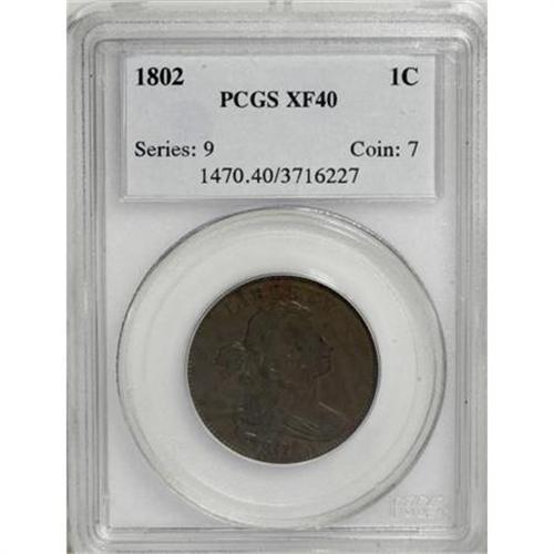 <B>1802 1C XF40 PCGS.</B></I> S-225, B-1, R.3. This Sheldon marriage is noted for clashed denticles near the bust truncation, and a die scratch from the left edge of the fraction bar. A medium brown representative with pleasing definition and a moderate mark near the R in AMERICA. EAC 20.<BR><BR><B>Coin Engraver:</B> Robert Scot<BR><BR><b>Shipping:</b> Coins & Currency (<a target="_blank" href="http://www.heritageauctions.com/common/shipping.php">view shipping information</a>)