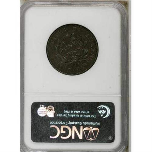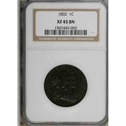 <B>1802 1C XF45 NGC.</B></I> S-238, B-11, Low R.4. Attributed by clash marks under the chin, four berries on the right branch, and no inside berry opposite E of ONE. Semi-gloss medium brown surfaces are quite smooth, save for slight roughness along the right reverse margin. The design elements are nicely centered and well defined. EAC 20.<BR><BR><B>Coin Engraver:</B> Robert Scot<BR><BR><b>Shipping:</b> Coins & Currency (<a target="_blank" href="http://www.heritageauctions.com/common/shipping.php">view shipping information</a>)