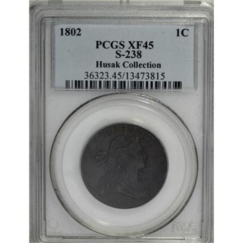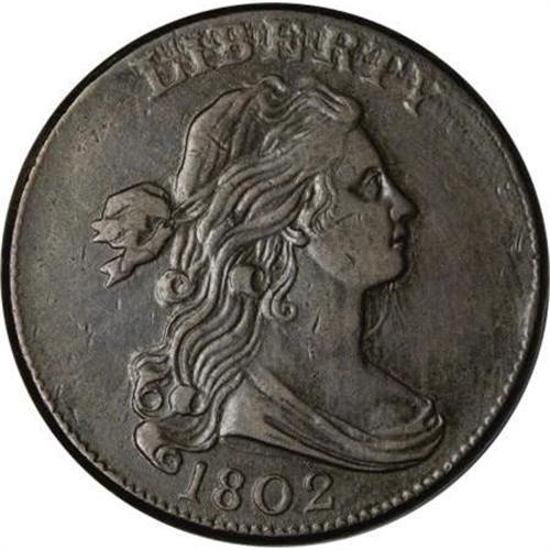 <B>1802 1C XF45 PCGS. S-238, B-11, R.4.</B></I> <B>Bland VF25; tied for CC-5. Noyes VF30; tied for CC-1. Photo #ANS 1442. Our EAC Grade VF30.<BR><BR>Equivalents. </B></I>McGirk 16A; Ross 5-M; Newcomb 16; EAC 16; <I>Encyclopedia </B></I>1748; PCGS #1470.<BR><B><BR>Variety. </B></I>Widest date. Missing berry right of ONE. The obverse appears on S-237 and S-238. The reverse appears on S-238.<BR><B><BR>Surfaces.</B></I> Mostly dark olive and steel, with a small area of lighter tan inside the wreath. A few small marks are visible on Liberty's head and neck, but most other abrasions are consistent with the grade. The obverse has a tiny rim bruise at 3 o'clock. Faint surface roughness is evident with a glass.<BR><BR><B>Die State III. </B></I>Minor clash marks with a faint die crack through the top of STATES. The lower reverse is shattered with several fine cracks.<BR><BR><B>Appearances. </B></I>The reverse is illustrated in <I>Early American Cents</B></I> and in <I>Penny Whimsy</B></I>.<BR><BR><B>Census. </B></I>The Census is remarkably low, even for a cent that is rated R.4. Quite a number of VF20, VF25, and VF30 coins are known, but there is not a single survivor that grades better than VF30. This coin is one of the "Sheldon-ANS" coins, placed in the ANS trays in exchange for another. Today, title for most of the "Sheldon-ANS" coins has been cleared. In 2001, Ted Naftzger received this coin in exchange for the original ANS coin that came from George Clapp.<BR><BR><B>Commentary.</B></I> This is the scarcest "collectible" 1802 variety; only the NC-1 and NC-2 are rarer. <BR><BR><B>Provenance. </B></I><I>Dr. William H. Sheldon; ANS (2001); R.E. Naftzger, Jr.</B></I><BR><BR><b>Shipping:</b> Coins & Currency (<a target="_blank" href="http://www.heritageauctions.com/common/shipping.php">view shipping information</a>)