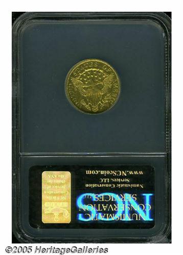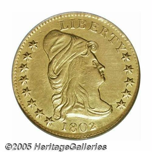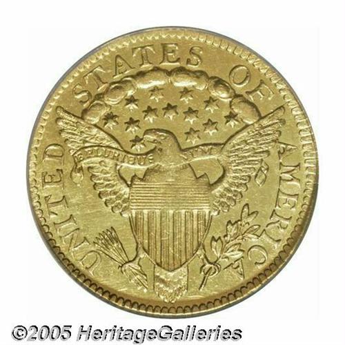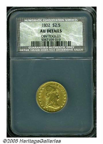 <B>1802<$2 1/2> AU Details, Obverse Tooled, NCS.</B></I> B-4, Breen-6118, Bass-3009, R.4. Among the early gold coinage, the quarter eagle was the least accepted and least popular denomination. So few were coined that these coins were seldom seen in circulation, and at the same time, bankers did not like them for they were too difficult to handle when compared to Half Eagles and Eagles. This left melting in the bullion dealer's pot as the only alternative, thus few have survived today. Mint records suggest that 3,035 examples were coined, and a little less than 10% of that number is believed to exist today. All of those coins were produced from a single obverse die and three different reverse dies.<BR> This example has bright yellow-gold surfaces on both sides, and the obverse has been extensively tooled to eliminate some unknown defects. The reverse appears pristine with pleasing green-gold color and fully prooflike fields. The central design on both sides is weakened due to inadequate striking pressure.