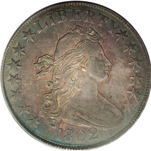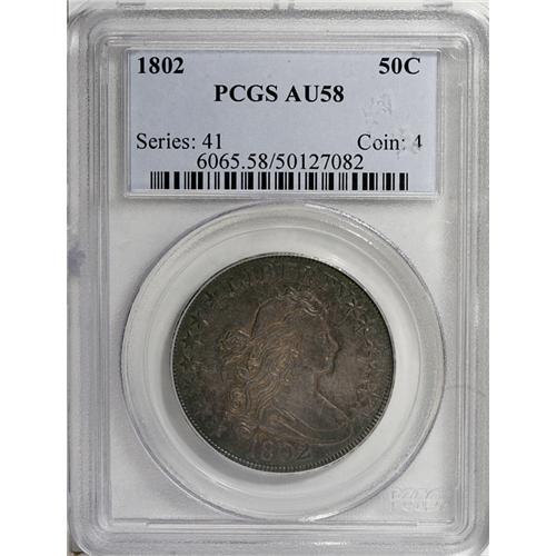 <B>1802 50C AU58 PCGS.</B></I> O-101, R.3. Boasting the lowest mintage of any Heraldic Eagle half dollar, just 29,980 pieces, the 1802 has long been a comparatively unheralded issue among early issues of the denomination and an extremely elusive date in AU and finer grades. Not only is the coin offered here uncommonly high grade for this low mintage scarcity, but the originality of the piece and its almost total lack of distractions sets it apart from the few remaining survivors. Both sides are layered in gunmetal, coppery-gold, and sea-green toning and beneath the color are considerable remnants of luster. Often accompanied by adjustment marks, this piece appears to have escaped that malady, and only incidental contact marks are noted in the lower left obverse field. A spectacular find for the early half dollar specialist. Population: 6 in 58, 2 finer (11/06).<BR><I>From The Temecula Collection.</B></I><BR><BR><b>Shipping:</b> Coin/Currency (<a target="_blank" href="http://www.heritageauctions.com/common/shipping.php">view shipping information</a>)