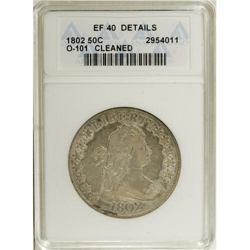 <B>1802 50C --Cleaned--ANACS. XF40 Details.</B></I> O-101, R.3. The only dies for this early Heraldic Eagle date. Mottled khaki-gold and ocean-blue toning cedes to slate-gray near the rims. E PLURIBUS UNUM is mostly legible, and glimmers of luster remain. A hairlined piece with inconspicuous pinscratches in front of the mouth and below the jaw.<BR><I>From The Hoosier Discovery Collection.</B></I><BR><BR><b>Shipping:</b> Coins & Currency (<a target="_blank" href="http://www.heritageauctions.com/common/shipping.php">view shipping information</a>)