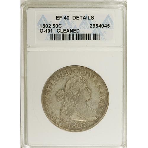<B>1802 50C --Cleaned--ANACS. XF40 Details.</B></I> O-101, R.3. The sole dies for this underappreciated date, which has a reported mintage of less than 30,000 pieces. A golden-brown and chalk-gray piece with pleasing definition. The motto is fully legible. Lightly hairlined, as are most early half dollars.<BR><I>From The Hoosier Discovery Collection.</B></I><BR><BR><b>Shipping:</b> Coins & Currency (<a target="_blank" href="http://www.heritageauctions.com/common/shipping.php">view shipping information</a>)