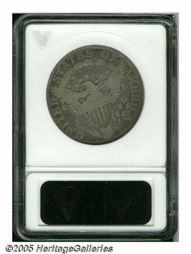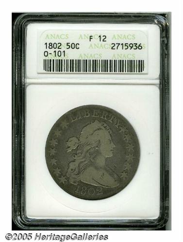 <B>1802<50C> Fine 12 ANACS.</B></I> O-101, R.3. The only known die pair. The degree of remaining design detail is quite good, on each side, for the assigned grade. The lightly toned surfaces reveal a few scattered, shallow pits (as struck) that were on the planchet prior to the striking of the coin. The remaining marks are quite trivial, and include a faint pinscratch that bisects the eagle's head and shield. The dies were rotated clockwise by approximately thirty degrees.<BR><I>From the Dr. Kurt Peters Collection.</B></I> From the Dr. Kurt Peters Collection.