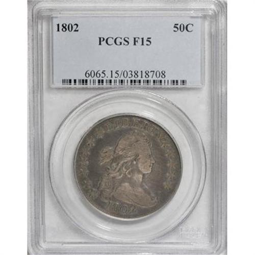 <B>1802 50C Fine 15 PCGS.</B></I> O-101, R.3. A golden-gray piece with pleasing definition on Liberty's curls. About half of E PLURIBUS UNUM is present. The obverse has horizontal hairlines, and a thin mark is noted beneath the chin.<BR><BR><b>Shipping:</b> Coins & Currency (<a target="_blank" href="http://www.heritageauctions.com/common/shipping.php">view shipping information</a>)