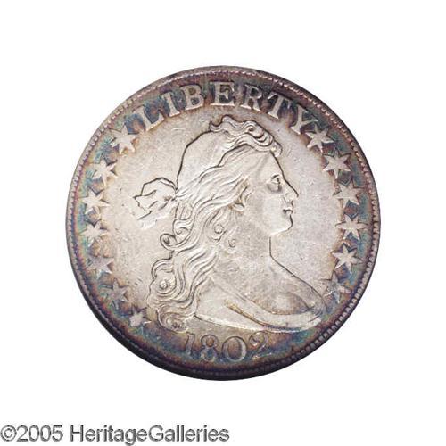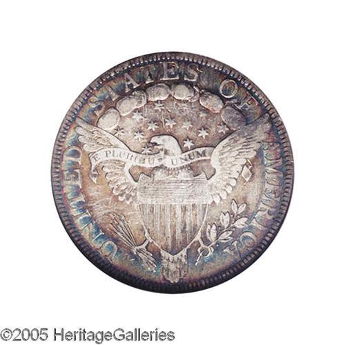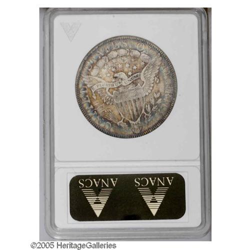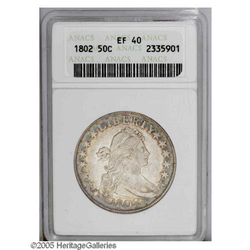 <B>1802<50C> XF40 ANACS.</B></I> O-101, R.3. The only variety of the year. A scarce date, with only 29,890 minted. Bright silvery surfaces display peripheral aqua-green, lavender, and gold-brown toning on the obverse, which is joined by golden-brown patination on the reverse center. The design elements are well centered on the planchet, and the dentilation is complete on both sides, though considerably bolder on the reverse. Nice detail is apparent on the devices, though most of the star centers on each side are flat. A few minute marks are scattered about, particularly on the obverse, but none are serious.<BR><I>From The Diamond Collection, Part One.</B></I>