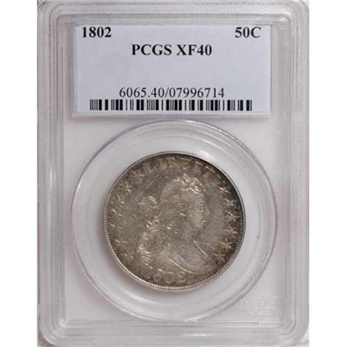 <B>1802 50C XF40 PCGS.</B></I> O-101, R.3, the only dies. This attractive representative has a pleasing quotient of luster within Liberty's hair, and the legends and wings also gently shimmer with luster. The wingtips and Liberty's shoulder and cheek display only moderate wear. A couple of thin marks are present in front of the neck and beneath ERT, and a small area above the hair ribbon is mildly granular. Population: 9 in 40, 30 finer (6/07).<BR><BR><B>Coin Engraver:</B> Robert Scot<BR><BR><b>Shipping:</b> Coins & Currency (<a target="_blank" href="http://www.heritageauctions.com/common/shipping.php">view shipping information</a>\)