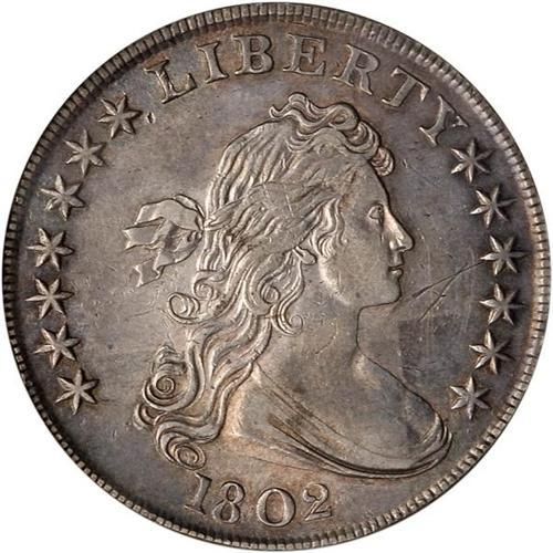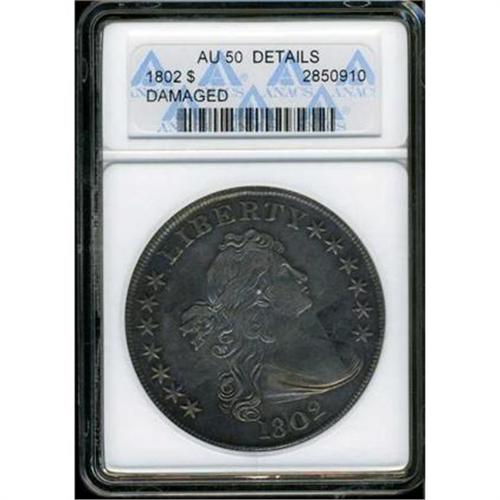 <b>1802 Draped Bust Dollar. Narrow date. ANACS graded Details of AU50 Damaged.</b> Deep gray patina but the devices are very sharp, indicating a coin that saw little use in circulation before it went into hiding, eventually to find its way into a collector's set of coins <b>(PCGS # 6895)</b> <i>