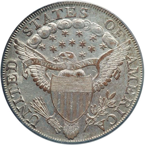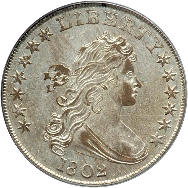 1802 Draped Bust Dollar. PCGS graded AU-53. Subset of PCGS # 40087. In a new secure plus holder. Among the more sharply defined late issues in the series, this scintillating example breaks the trend from 1798-1800 and displays uncommon sharpness on all including the highest points of the design. Even the normal softness on the eagle and scroll is absent. Both sides are graced by original toning. Pop 2; 2 finer in 65 for the variety (PCGS # 40088) .