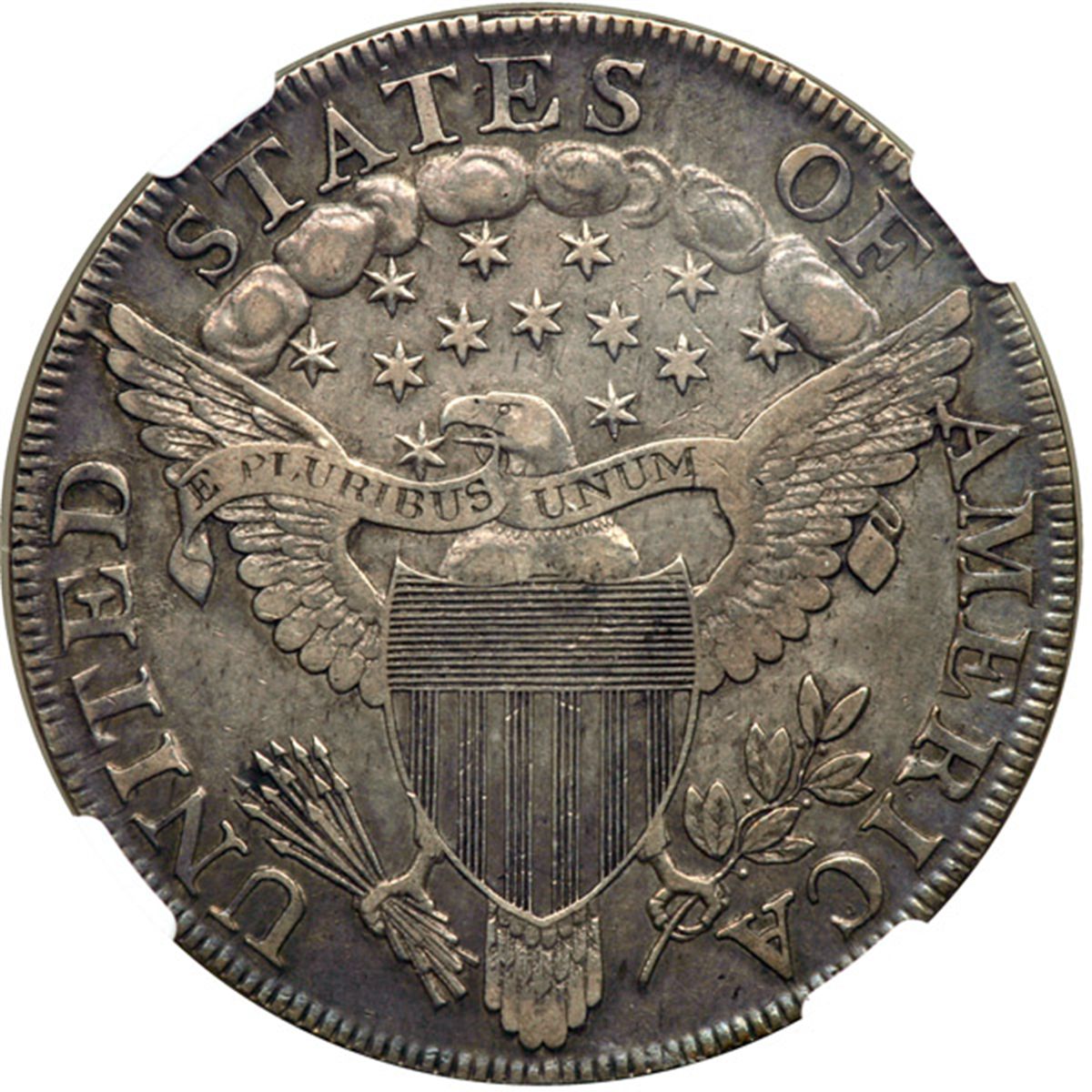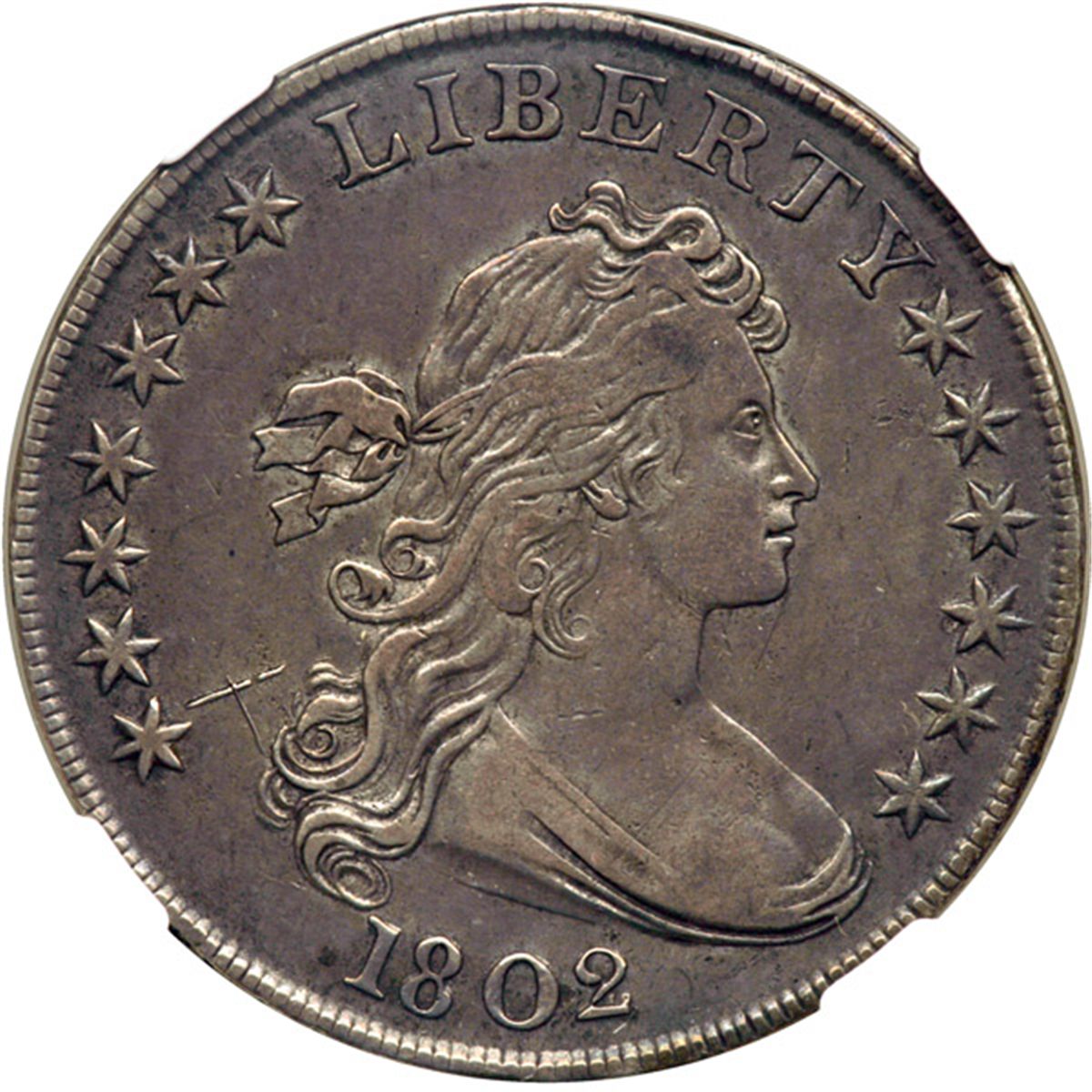 1802 Draped Bust Dollar. NGC XF Details, graffiti. Excellent detail and nicely toned. We note two antique scratches in the left obverse field. Only 41,650 minted, scarcest of the 1801-03 threesome as far as the original mintage.