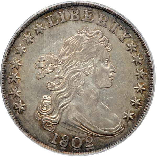 1802 Draped Bust Dollar. PCGS graded AU-58. Subset of PCGS # 40087. In a new secure plus holder. Condition Census. Peripheral russet and gray toning lessens to natural dove grade in the field on both sides. At the moment when luster is a key determinant of the grade of a high-class AU58 like this, it goes without saying the devices should also be struck boldly by the dies. And here, the coin is bold throughout. No compromises here. The coin, whose photos show only half the beauty of the piece, is truly one in a million that collectors will esteem to buy if at all possible.