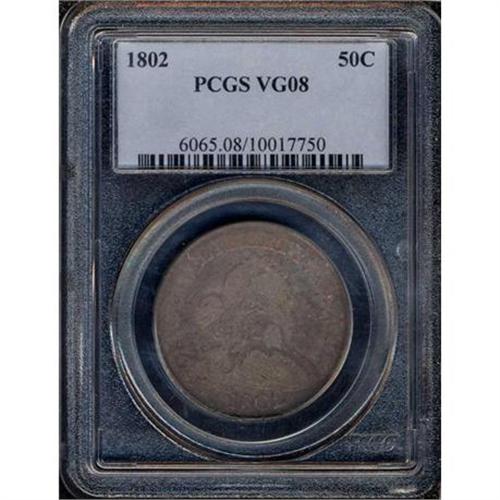 <b>1802 Draped Bust Half Dollar. PCGS graded Very Good 08.</b> Smooth surfaces, pleasing "old silver" color, and no problems whatsoever. Mintage even a bit lower than in 1801, at 29,890 pieces this year <b>(PCGS # 6065)</b> <i>