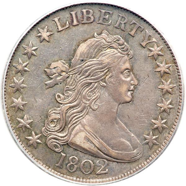 1802 Draped Bust Half Dollar. PCGS graded AU-53. Housed in a new secure plus holder. Even toning. The surfaces and color on this rare date are very attractive. We note steel gray tones with more than enough golden luster within the devices on both sides to entice buyers. Sharp and well preserved, with full sharp curls on Liberty and sharp details on the eagle's wings. Most of the stars are also well formed. A true rarity in this grade, it deserves a place in the finest collection. An valuable conquest for the energetic Bust Half Dollar specialist.