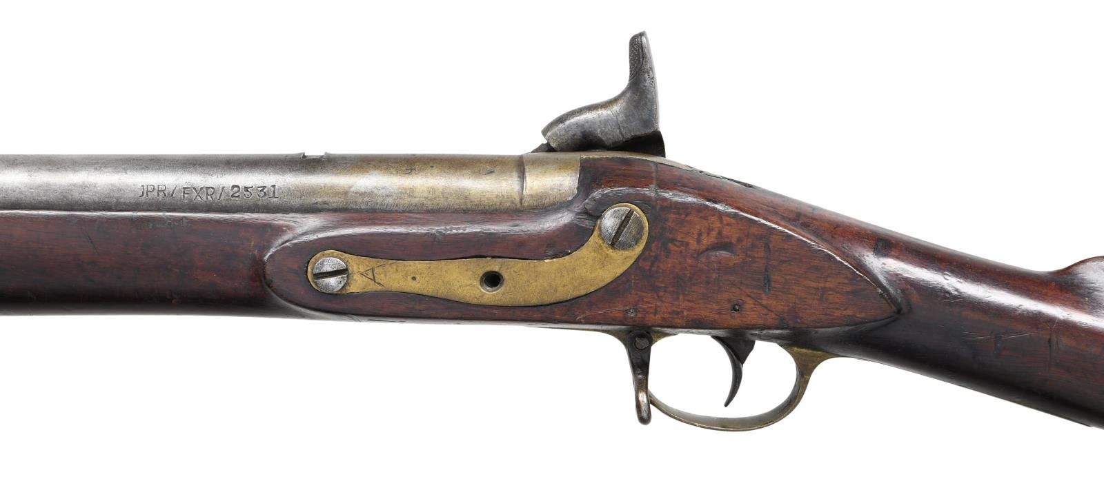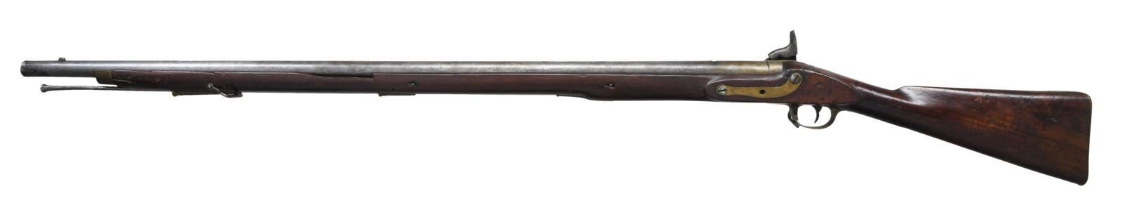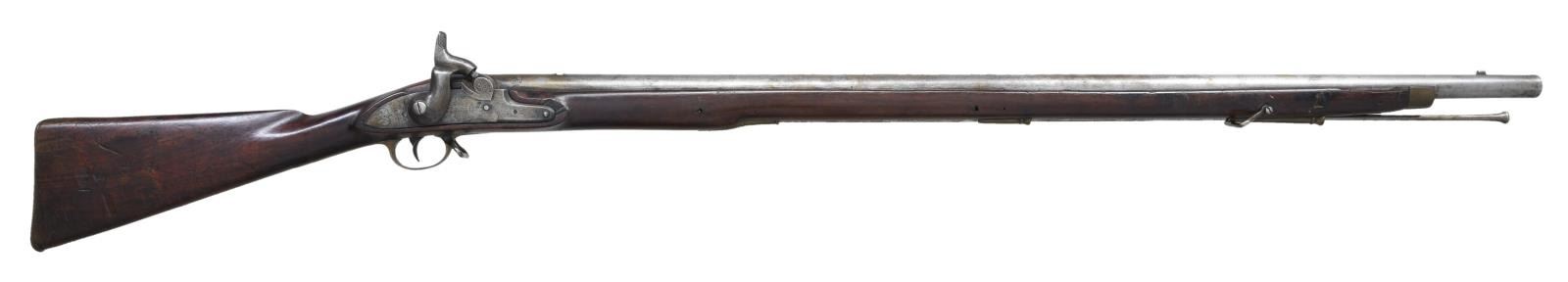 MUSKETOON BY NOCK WITH EAST INDIA COMPANY CYPHER. Cal. 78. NSN. Pinned 38.75" round barrel with worn original flintlock proof, added series of inspection initials and numbers. Lock has "NOCK" almost removed when converted to percussion with addition of braised percussion bolster. Tail of lock has "1802" and British East India heart trademark.CONDITION: good to very good overall. Appears complete and original. There are Far East markings on trigger guard and stock, possibly Nepalese. Mechanics are fine come clear smooth bore. (01-22943/JS). ANTIQUE. $700-900.