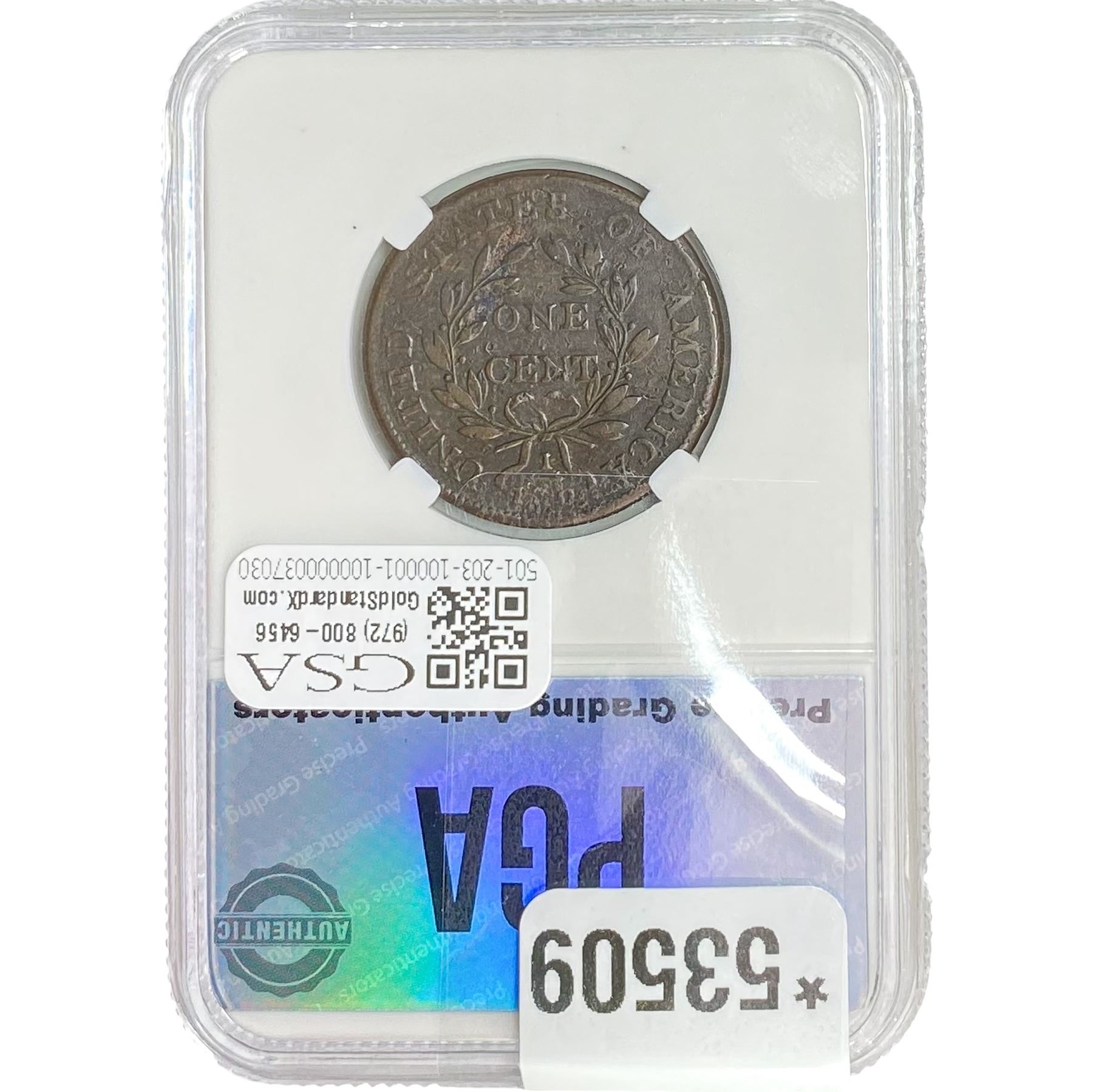 l. All non-certified coins and currency are guaranteed genuine, but are not guaranteed as to grade, since grading is a matter of opinion, an art and not a science, and therefore the description rendered by GSA or any third-party grading service may not agree with the opinion of others (including trained experts), and the same expert may not grade the same item with the same grade at two different times. GSA may, but is not obligated to, express an opinion as to non-certified numismatic items, in GSA’s opinion, or by its employees’ experience and the current interpretation of the American Numismatic Association’s standards as of the date the catalog was prepared. There is no guarantee or warranty expressed or implied that the grading opinions utilized by GSA, if any, will meet the standards of any grading service at any time in the future.