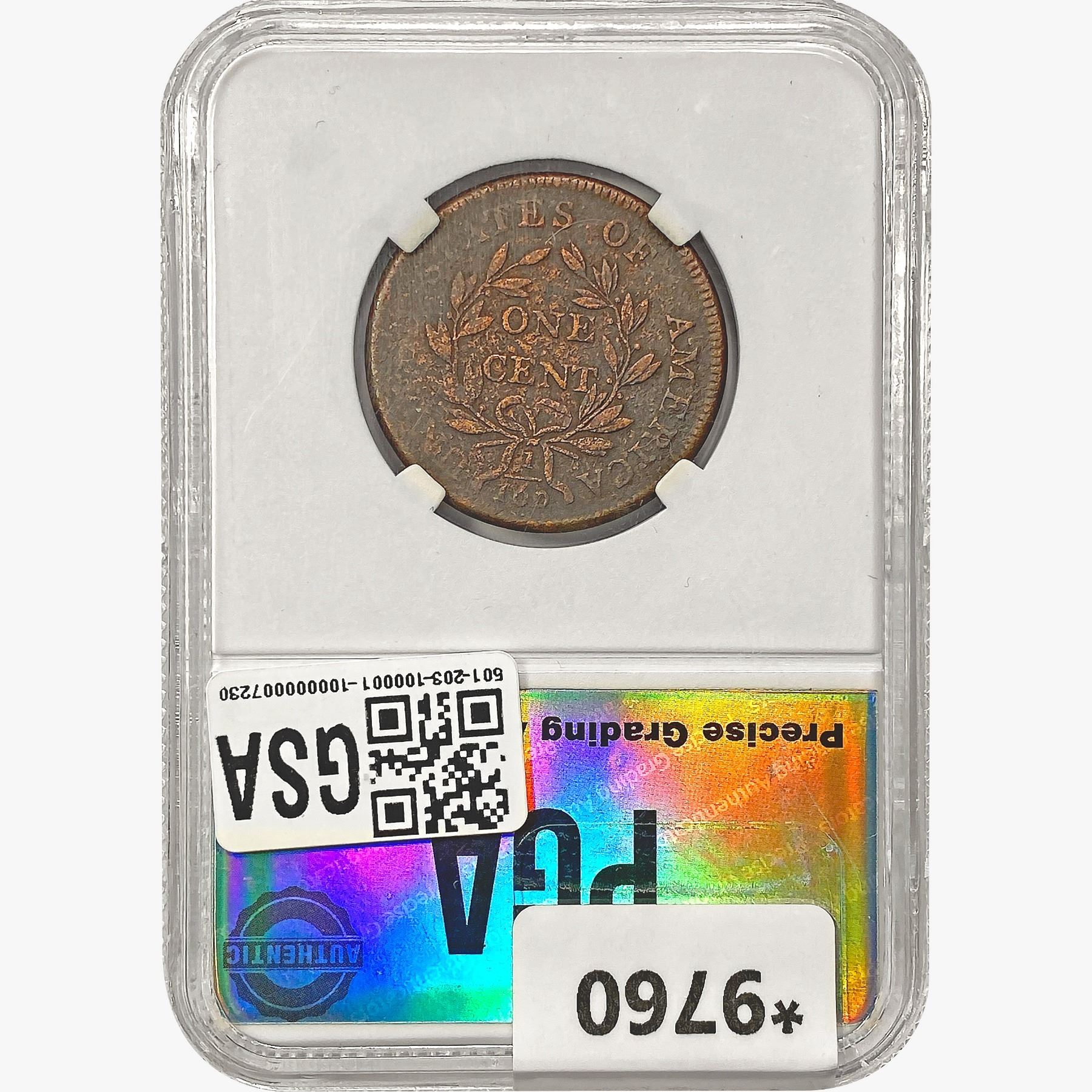 l. All non-certified coins and currency are guaranteed genuine, but are not guaranteed as to grade, since grading is a matter of opinion, an art and not a science, and therefore the description rendered by GSA or any third-party grading service may not agree with the opinion of others (including trained experts), and the same expert may not grade the same item with the same grade at two different times. GSA may, but is not obligated to, express an opinion as to non-certified numismatic items, in GSA’s opinion, or by its employees’ experience and the current interpretation of the American Numismatic Association’s standards as of the date the catalog was prepared. There is no guarantee or warranty expressed or implied that the grading opinions utilized by GSA, if any, will meet the standards of any grading service at any time in the future.