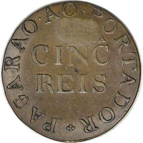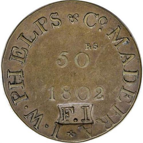<B>1802 I.W.Phelps & Co. 50 Reis Counterstamped "F.I."</B></I> Copper, 30 mm. Madeira Islands, which are located off the coast of Morocco and north of the Canary Islands. The islands were discovered and occupied by the Portuguese from 1418 until they were occupied by the British in 1801 and again in 1807-14. This token issued by I.W. Phelps & Co is dated 1802 and the denomination is 50 reis, counterstamped with the letters F.I. Current market value is approximately $200.<BR><BR><b>Shipping:</b> Coins & Currency (<a target="_blank" href="http://www.heritageauctions.com/common/shipping.php">view shipping information</a>)