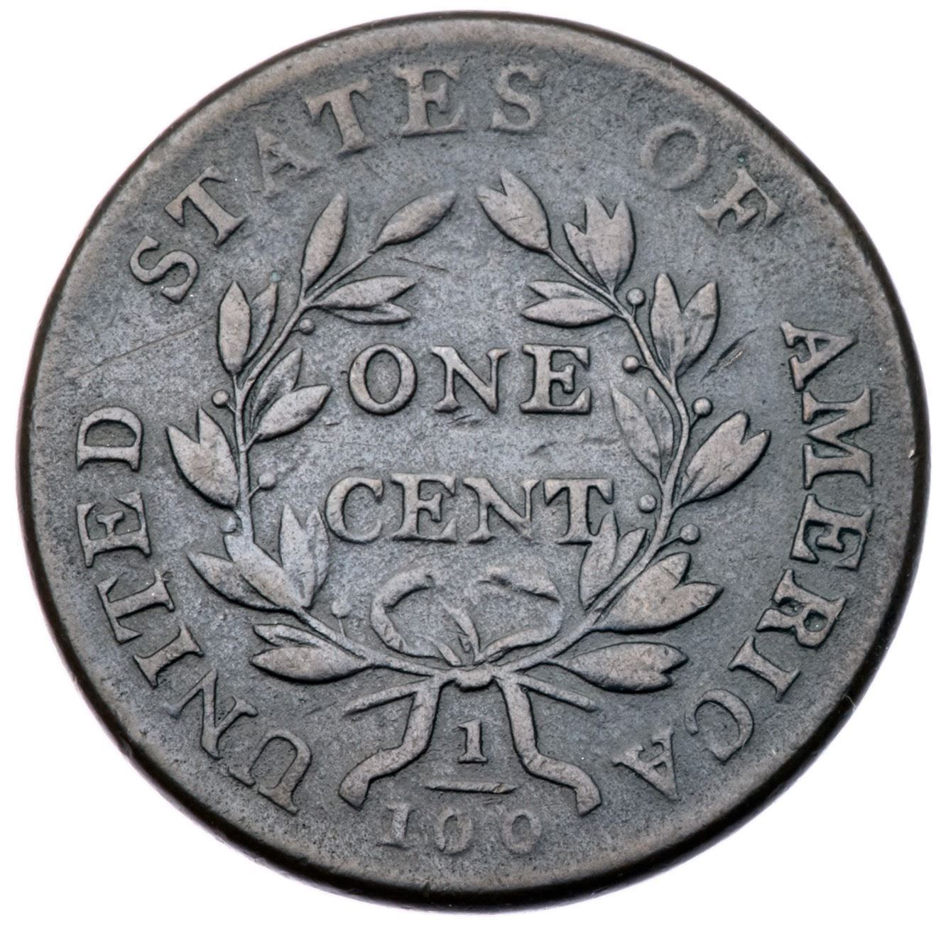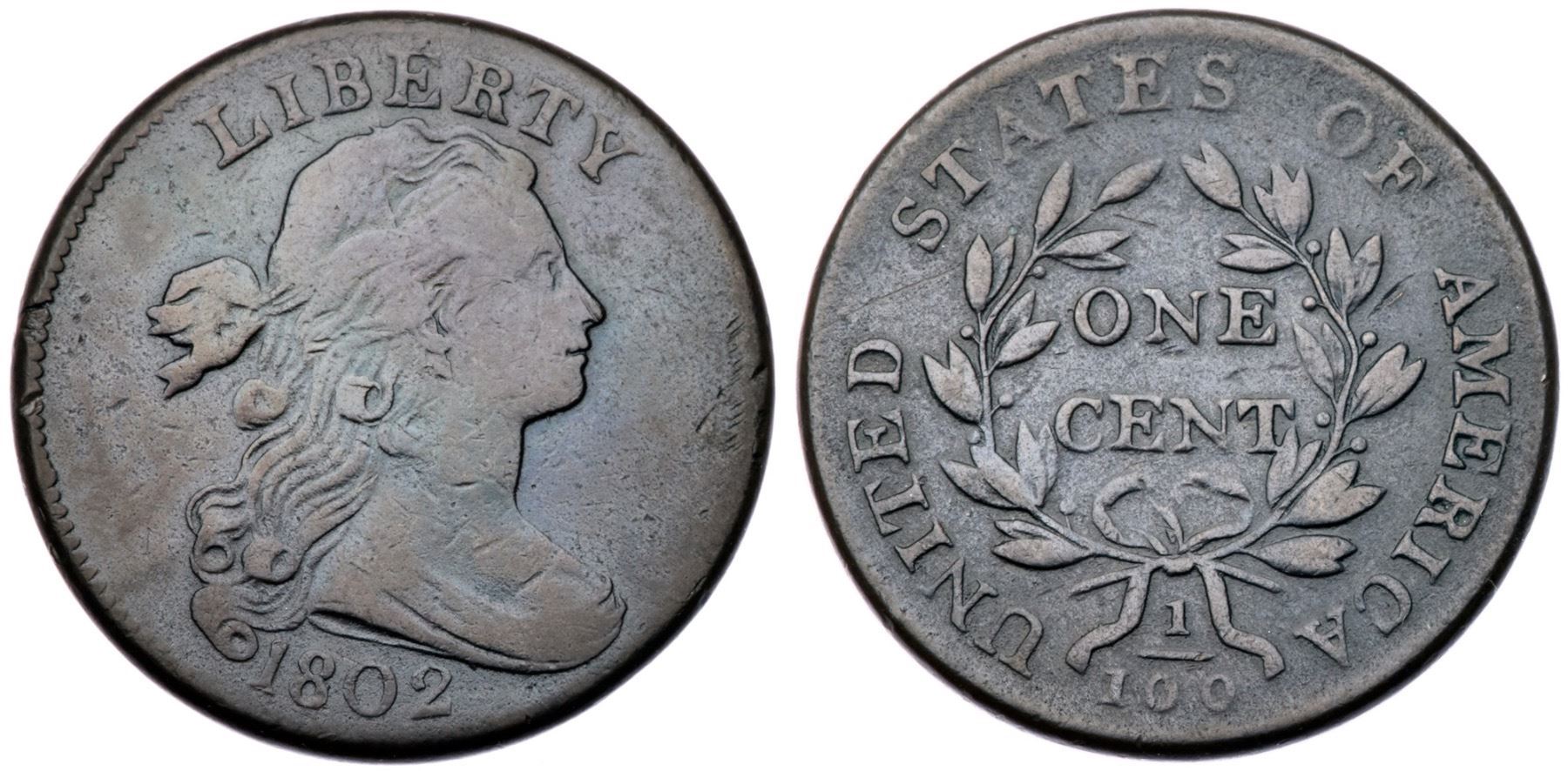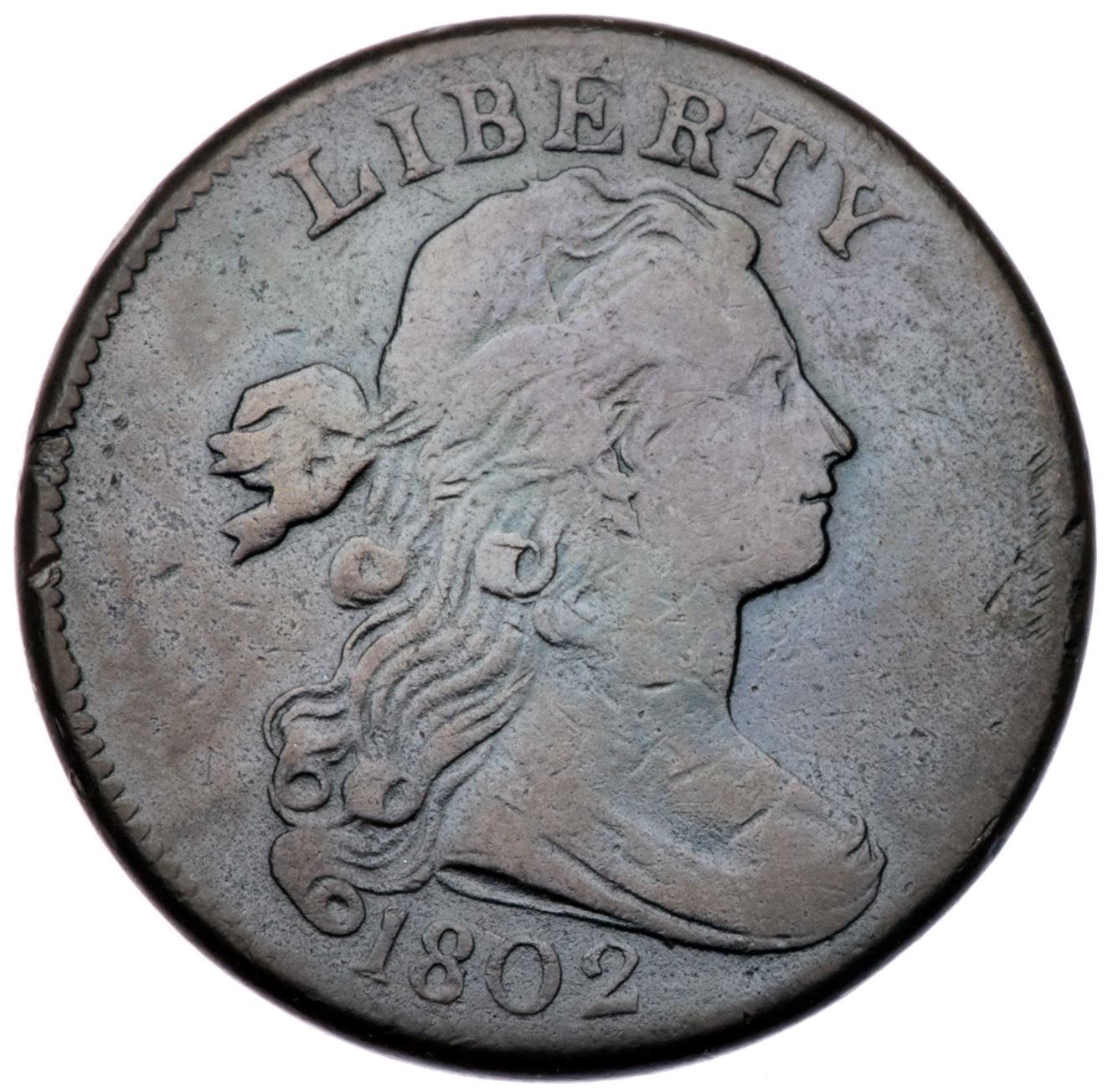 1802 NC-1 R-5+ F12Slightly sharper but there is a collection of small contact marks near the edge before the chin. Otherwise just a few trivial marks on reasonably smooth surfaces. Mostly glossy olive brown and steel with lighter brown on the devices. Looks smooth but there is microscopic roughness in the fields and protected areas on both sides. LDS, Breen state IV early. The bisecting die crack down through the portrait is clear. Graded F12 by Del Bland and tied for CC#6. Noyes says F15 net VG10 and tied for CC#6, his photo #25908.Certificate Number: Pedigree: Ex Raymond Shab 1950-C. Douglas Smith-Dorothy I. Paschal-Eugene Exman-Denis W. Loring-C. Douglas Smith 4/1980-Fred H. Borcherdt Collection