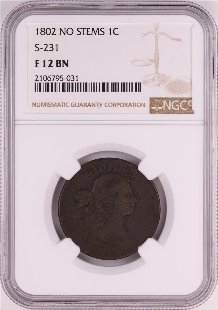 One 1802 No Stems S-231 Draped Bust Large Cent Coin NGC F12 BN. NGC Certified.