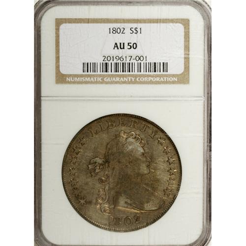 <B>1802 S$1 Narrow Date AU50 NGC.</B></I> B-6, BB-241, R.1. A very pleasing example of this common variety that is distinguished by the missing right serif at the base of the T in LIBERTY on the obverse, and the protruding spur below cloud 3 on the reverse. Lacking a bit of highpoint detail from either rub or strike (or both), the surfaces are exceptionally clean for a coin that has seen ten points of wear. Lovely, iridescent gray, lilac, and golden patina covers both sides.<BR><BR><b>Shipping:</b> Coin/Currency (<a target="_blank" href="http://www.heritageauctions.com/common/shipping.php">view shipping information</a>)