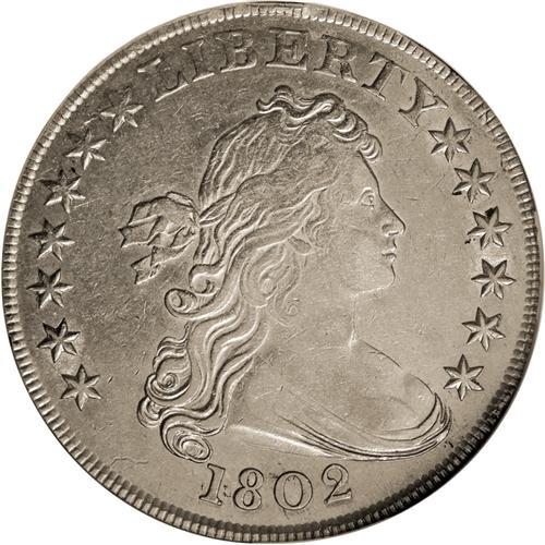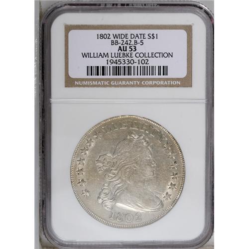 <B>1802 S$1 Narrow Date AU53 NGC.</B></I> B-5, BB-242, High R.5. Die State I. Perfect T; projection at lower right curve of D. This is a rare and often overlooked die marriage that is mostly populated by VF to XF examples and has perhaps fewer than 50 pieces extant in all grades. In practice, this variety is easily recognized by the perfect T in LIBERTY, the only 1802 Normal Date variety with this characteristic. It is the rarest Normal Date variety and the second rarest variety of the year. This lustrous AU representative has light silver-gray surfaces with hints of champagne toning on each side. Considerable luster is evident. Both sides have scattered surface marks and faint hairlines. Although a few finer examples are known, this piece is almost certainly in the Condition Census for the variety.<BR><I>Ex: Heritage (5/2003), lot 6463.</B></I><BR><I>From The William Luebke Collection.</B></I><BR><BR><b>Shipping:</b> Coin/Currency (<a target="_blank" href="http://www.heritageauctions.com/common/shipping.php">view shipping information</a>)