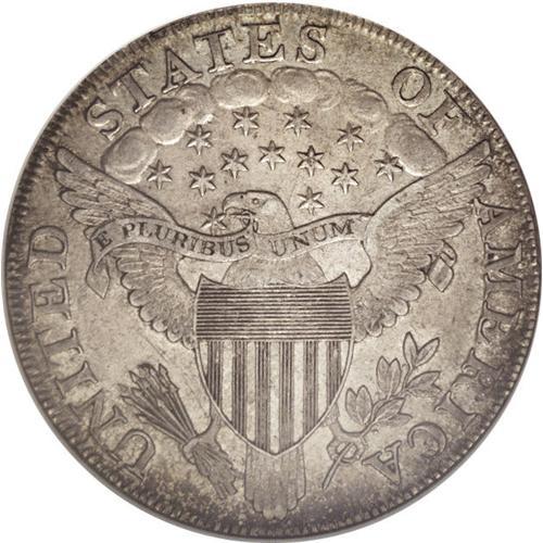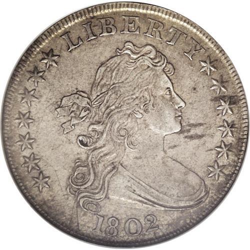 <B>1802<img border='0' src='http://www.heritagecoins.com/images/star.gif' width=10 height=10>$1> Narrow Date AU55 NGC.</B></I> B-6, BB-241, R.1. A bold striking, as is typical of the variety, with mottled copper-gold and charcoal-gray toning over both sides. Close examination only makes this natural early dollar all the more appealing, as blemishes are minimal and the underlying luster relatively subtle. One of the more available die pairings in the entire series of Draped Bust dollars in all grades, but a spectacular example for type purposes.