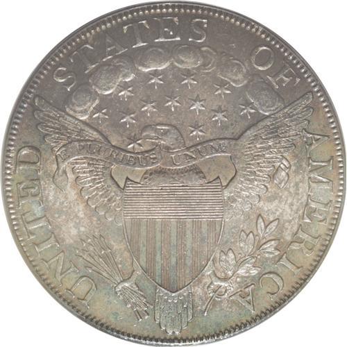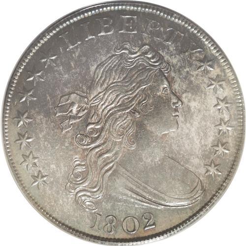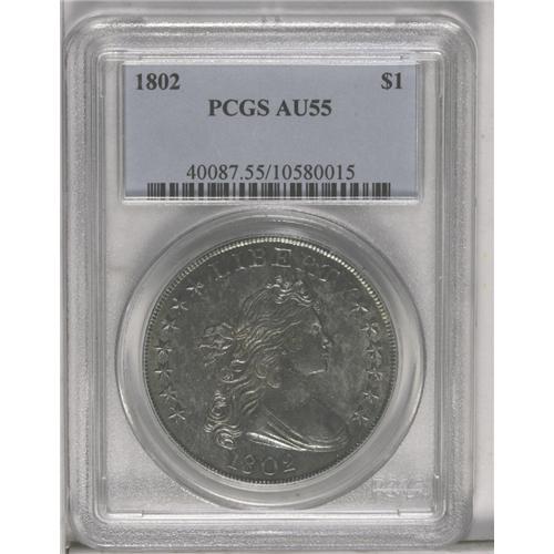 <B>1802<img border='0' src='http://www.heritagecoins.com/images/star.gif' width=10 height=10>$1> Narrow Date AU55 PCGS.</B></I> B-6, BB-241, R.1. Blue-green patina embraces this satiny and boldly defined Draped Bust dollar. A couple of minor marks are noted beneath the hair ribbon, but no other consequential contact is detected. Since there is only a trace of wear on the shoulder and other highpoints, the present piece comes as close to Mint State as can be affordably secured.<BR><I>From The Royal Oak Collection.</B></I>