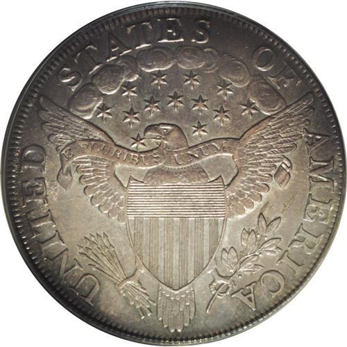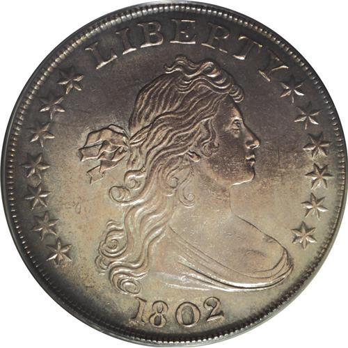 <B>1802<img border='0' src='http://www.heritagecoins.com/images/star.gif' width=10 height=10>$1> Narrow Date AU55 PCGS.</B></I> B-6, BB-241, R.1. The "Narrow Date" variety is something of a misnomer, since the 80 in the date is widely spaced. Nonetheless, Bolender-6 merits a separate <I>Guide Book</B></I> listing. The present example has substantial remaining luster, which percolates beneath the electric-blue and chestnut-brown patina. The glossy surfaces are nearly unmarked, and the strike is bold, even on the stars and clouds opposite Liberty's high relief shoulder.<BR><I>From The Royal Oak Collection.</B></I>