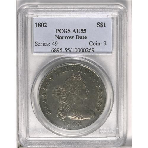 1802 S$1 Narrow Date AU55 PCGS. B-6, BB-241, R.1. The