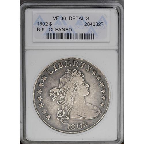 <B>1802<img border='0' src='http://www.heritagecoins.com/images/star.gif' width=10 height=10>$1> Narrow Date--Cleaned--ANACS. VF30 Details.</B></I> B-6, BB-241, R.1. Faint abrasive rubbing appears on both sides, although this piece has reacquired a pleasing light to medium gray appearance. Minor scratches and abrasions can be seen, mostly on the obverse.