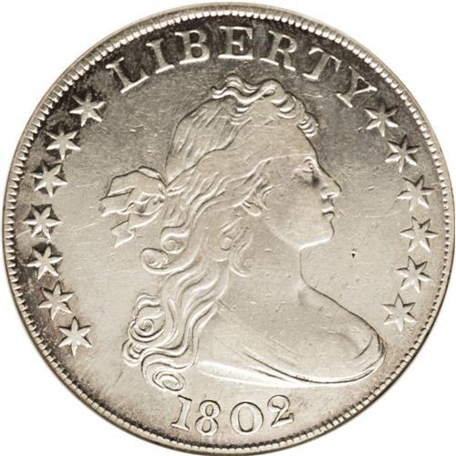 <B>1802<img border='0' src='http://www.heritagecoins.com/images/star.gif' width=10 height=10>$1> Narrow Date--Cleaned--ANACS. XF40 Details.</B></I> B-6, BB-241, R.1. The well detailed surfaces display few marks and pleasant light coloration. Somewhat subdued from an old cleaning, with a few wispy pinscratches and hairlines noted on each side. A nice coin for the grade with no large or objectionable abrasions.<BR><I>From The Catfish Creek Collection, Part Two.</B></I>