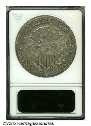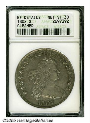 <B>1802<S$1> Narrow Date EF Details, Cleaned, Net VF30 ANACS.</B></I> B-6, BB-241. R.1. Close Date. Retoned to an attractive light silver with darker highlights near the devices. There are a couple of minor surface nicks on Liberty's neck and a minor scratch extending off the upper right leaf nearly to the E of AMERICA. Moderate hairlines can be seen from the past cleaning with a loupe.