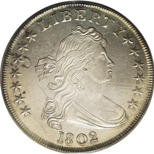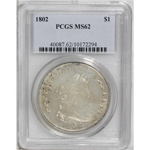 <B>1802<img border='0' src='http://www.heritagecoins.com/images/star.gif' width=10 height=10>$1> Narrow Date MS62 PCGS.</B></I> B-6, BB-241, R.1. This is one of the most common early silver dollar varieties, and even a number of Mint State examples are known. The present specimen is a remarkable representative of this issue. Only two die varieties are known for the 1802 Normal Date coins, from distinct obverse dies. This obverse has the right base of T missing entirely, and it is a common variety. The other variety, a much scarcer die marriage, has an obverse with a well-formed, perfect T in LIBERTY. The reverse is a common die used for silver dollars dated 1801, 1802, and 1803.<BR> Sharply struck with strong obverse and reverse details, and exceptional eye appeal. This example has rather prooflike surfaces with a hint of champagne and iridescent toning over silver brilliance. A few insignificant adjustment marks are evident along the lower obverse border.