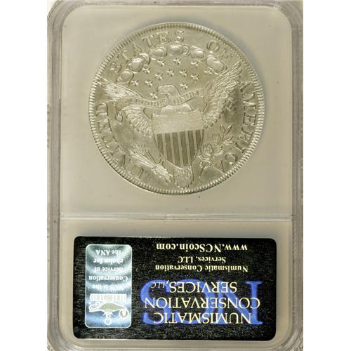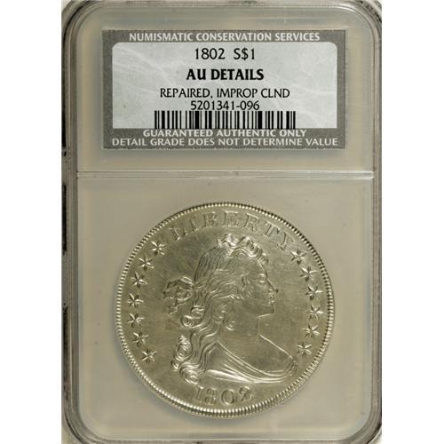 <B>1802 S$1 Narrow Date--Repaired, Improperly Cleaned--NCS. AU Details.</B></I> B-6, BB-241, R.1. This sharply defined early dollar has consistent light silver-gray toning. The faintly hairlined and lackluster fields have been smoothed with some skill, but repairs are detected on the obverse field beneath Liberty's hair ribbon, and on the reverse field above the olive branch. An opportunity to secure an affordable piece with little actual circulation wear.<BR><BR><b>Shipping:</b> Coins & Currency (<a target="_blank" href="http://www.heritageauctions.com/common/shipping.php">view shipping information</a>)