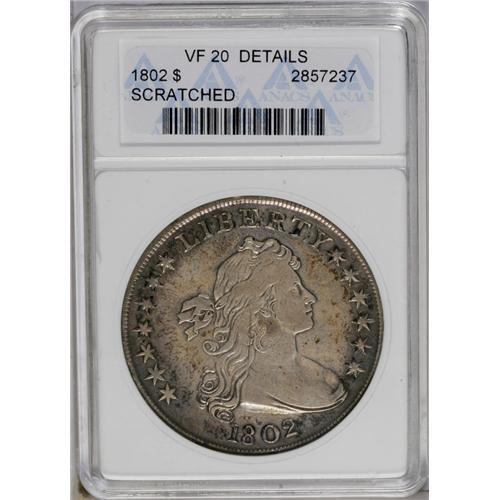 <B>1802<img border='0' src='http://www.heritagecoins.com/images/star.gif' width=10 height=10>$1> Narrow Date--Scratched--ANACS. VF20 Details.</B></I> B-6, BB-241, R.1. A large letter B is faintly pinscratched onto the obverse, from the bust truncation to the ear. This glossy but nicely detailed example has russet-gray borders and tan centers.
