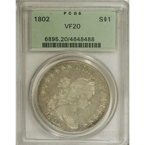 <B>1802 S$1 Narrow Date VF20 PCGS.</B></I> B-6, BB-241, R.1. A slate-gray Draped Bust dollar with impressive remaining detail within the curls and wings. All letters in E PLURIBUS UNUM are at least partly legible, and no marks merit individual mention. Encapsulated in a green label holder.<BR><BR><b>Shipping:</b> Coins & Currency (<a target="_blank" href="http://www.heritageauctions.com/common/shipping.php">view shipping information</a>)