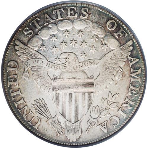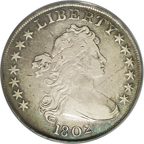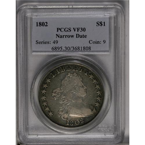 <B>1802<img border='0' src='http://www.heritagecoins.com/images/star.gif' width=10 height=10>$1> Narrow Date VF30 PCGS.</B></I> B-6, BB-241, R.1. Pale aquamarine and golden-brown colors endow the borders of this richly detailed Bust dollar. Glimpses of bright luster emerge from the wing feathers and hair curls. The portrait has a few faint abrasions that do not distract.<BR><I>From The Long Beach Family Collection.</B></I>