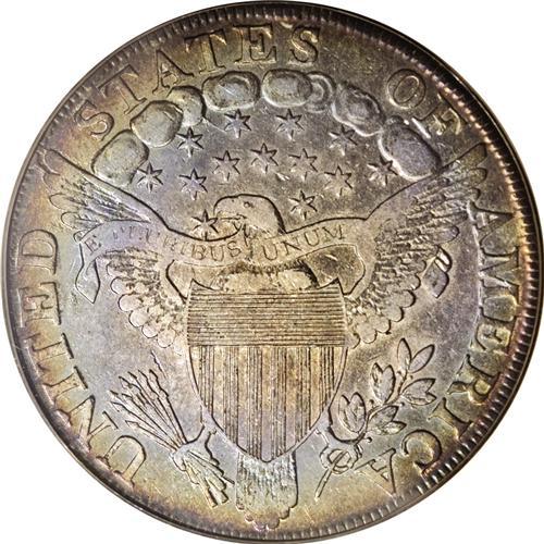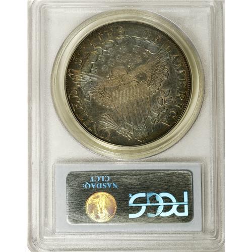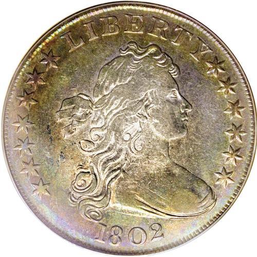 <B>1802 S$1 Narrow Date VF30 PCGS.</B></I> B-6, BB-241, R.1. The right foot of the T in LIBERTY is missing, assisting in prompt identification, and on the reverse the third cloud from the left shows a small protuberance beneath. The concentric patina is in shades of copper-gold, sky-blue, and forest-green.<BR><I>From The Hill Country Collection.</B></I><BR><BR><b>Shipping:</b> Coin/Currency (<a target="_blank" href="http://www.heritageauctions.com/common/shipping.php">view shipping information</a>)