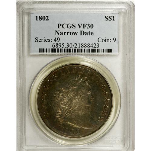 1802 S$1 Narrow Date VF30 PCGS. B-6, BB-241, R.1. The