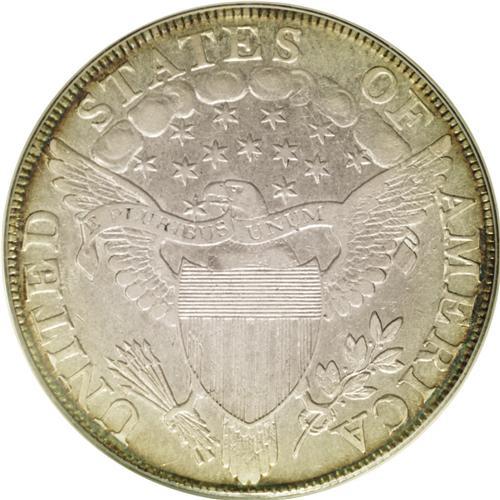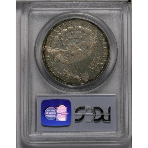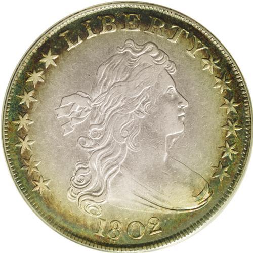 <B>1802<img border='0' src='http://www.heritagecoins.com/images/star.gif' width=10 height=10>$1> Narrow Date XF45 PCGS.</B></I> B-6, BB-241, R.1. The date is spaced 18 02 and the right foot of the T in LIBERTY is missing on this die marriage. The obverse of this bright silver-gray example is attractively framed in rich russet and blue-green iridescent toning. Well detailed overall, with a cluster of glossy old marks beneath Liberty's chin.<BR><I>From The Long Beach Family Collection.</B></I>