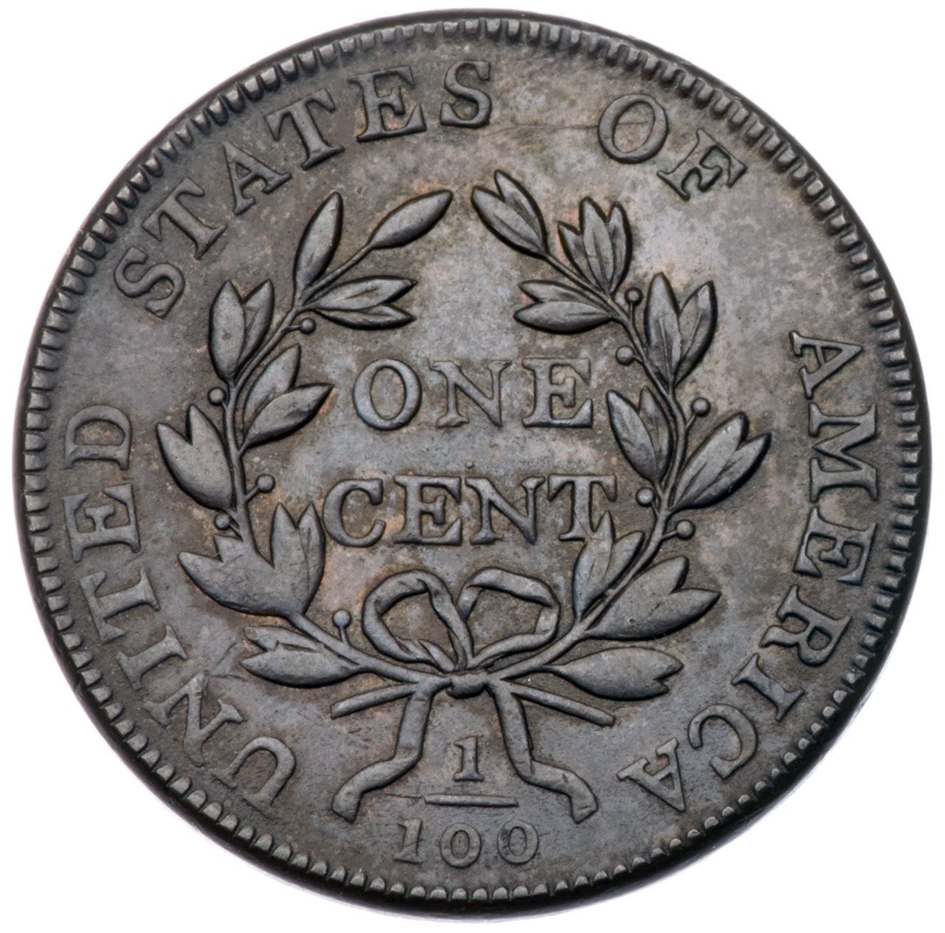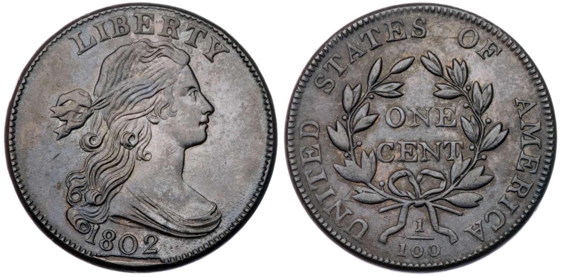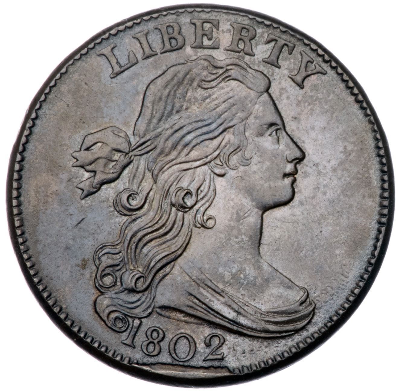 1802 S-225 R-3 EF45Slightly sharper but the toning is uneven, and that affects the eye appeal of an otherwise very impressive cent. Glossy dark olive brown mixed with light to medium brown on both sides. The strike is very sharp and there is just a hint of friction on the highest points of the devices. A tiny nick in the field below the lower end of the hair ribbon, another on the throat, and a faint hairline under AME to the dentils at the adjacent F are the only notable marks, and they are trivial. MDS, Breen state V, with a cud break below 802 and the dentils before the throat are crumbled. The fields are hard and slightly reflective. Graded AU50 and tied for CC#13 in the Bland census. Noyes says EF45 net VF30 and tied for CC#15, his photo #26195.Certificate Number: Pedigree: Ex C. H. Stearns, Mayflower Numismatic Auctions 12/2/1966:348-John Christensen (Excelsior Coin Galleries) 4/1984-Fred H. Borcherdt Collection