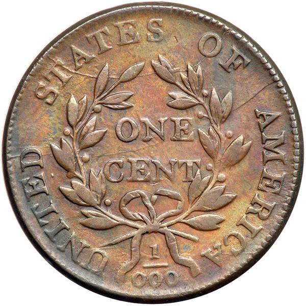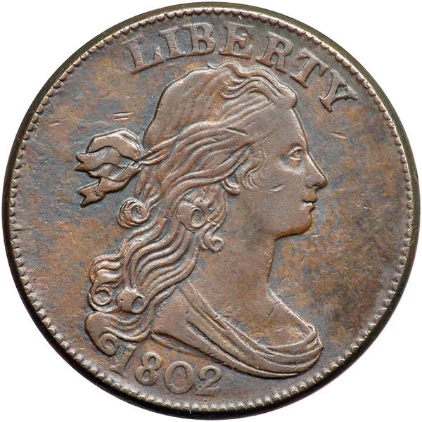 1802 S-228 R2 Error Fraction 1/000. VF-30. Ten points sharper but lightly cleaned and retoned glossy chocolate and olive brown with underlying lighter golden brown toning covering much of the reverse. No roughness or notable marks, the surfaces just a couple trivial contact marks from flawless. M-LDS, Breen state V. Die flaking is evident in the obverse fields and there are numerous die cracks on the reverse. The error fraction feature is obvious. Called EF40 net VF25 and tied for CC#20 in the Noyes census, his photo #38295.