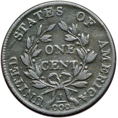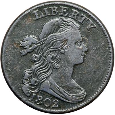 1802 S-228 R2. Fine-15. Error Fraction 1/000. Sharpness VF30 but there is some extremely fine roughness hidden under a glossy dark olive and steel patina. There are traces of shallow verdigris around the eye and a few more can be found elsewhere on the obverse if you look carefully with a good glass, but the eye appeal remains decent. MDS, Breen state III. The date, legends, and error fraction are all strong.